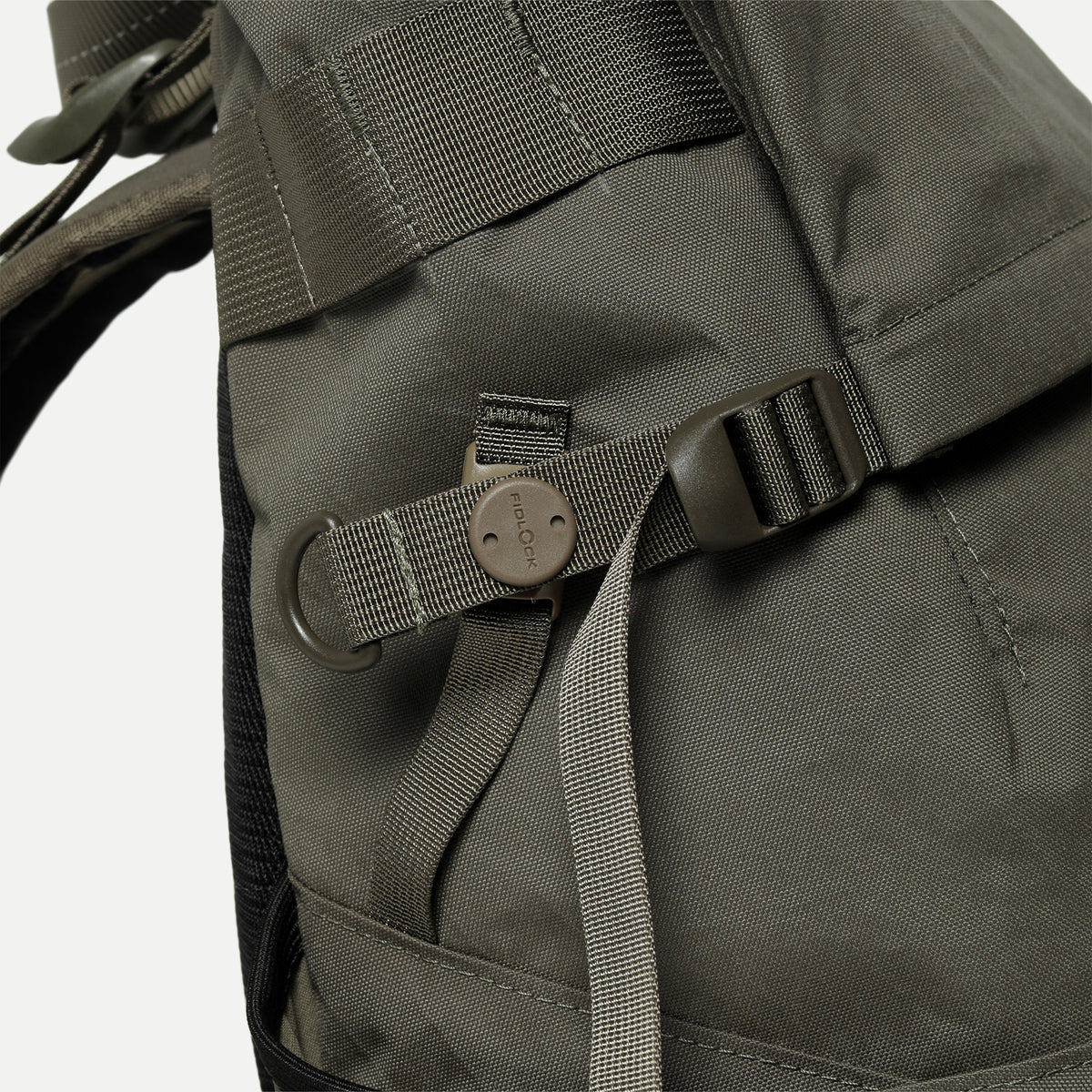 The Fidlock Snap side adjustment on the roll-top sleeve allows users to compress and secure the pack’s top edge, while the side compression straps double as bottle pocket adjusters and bag depth controls.