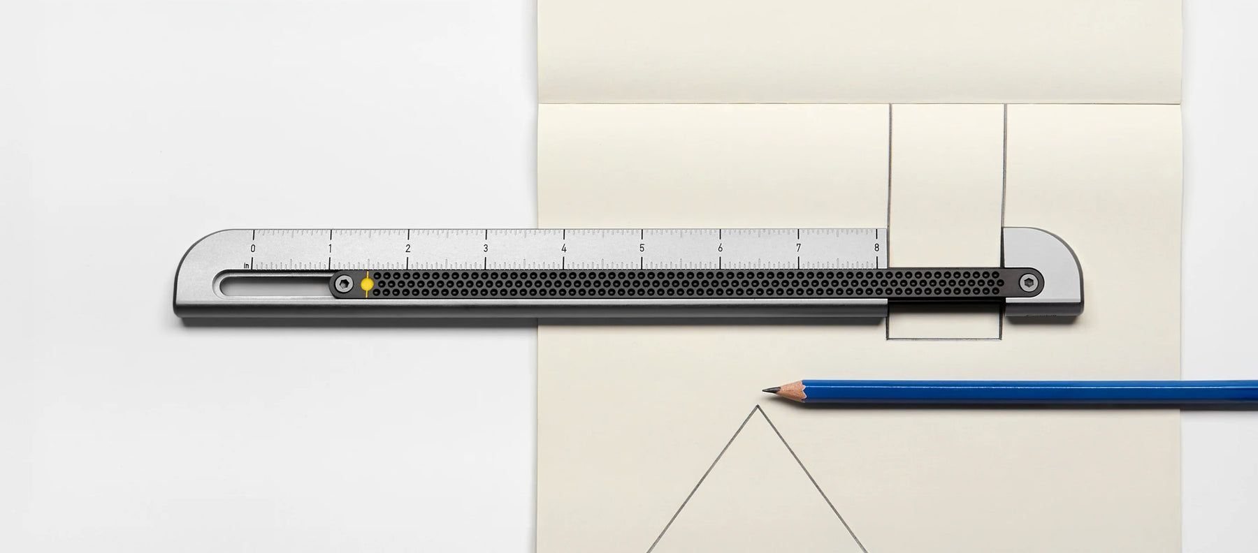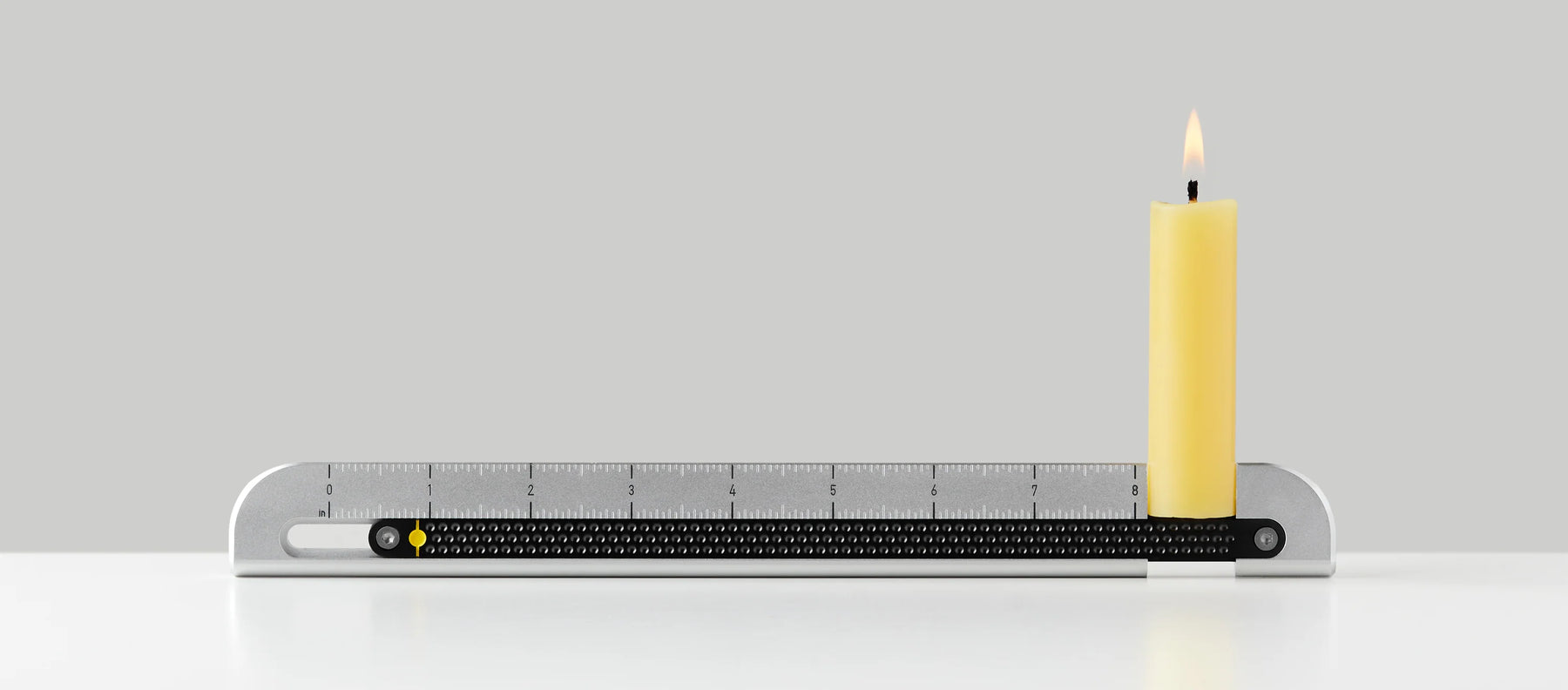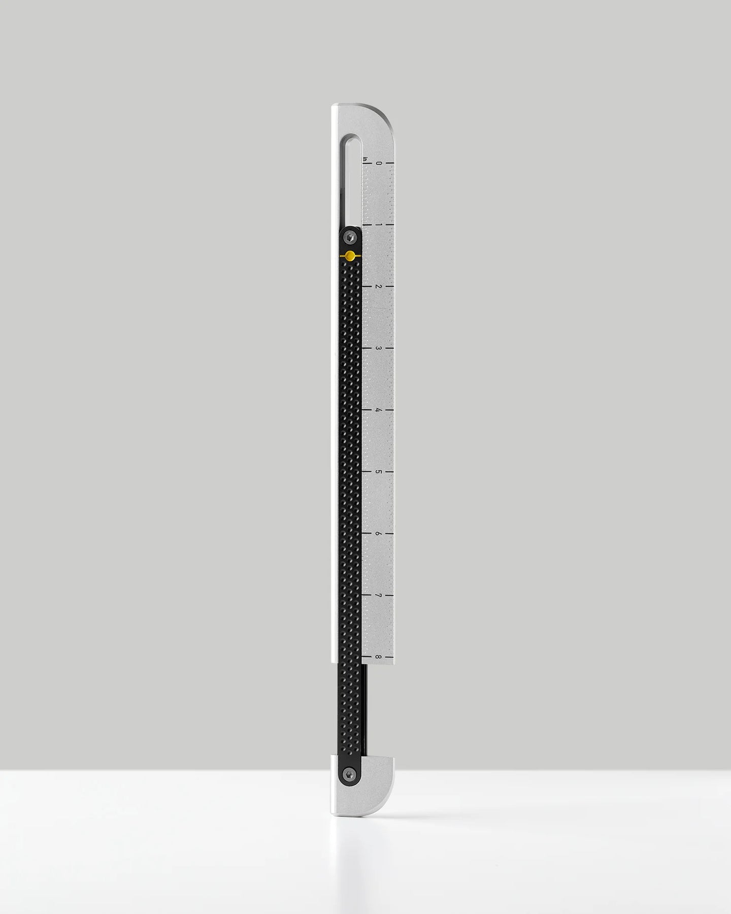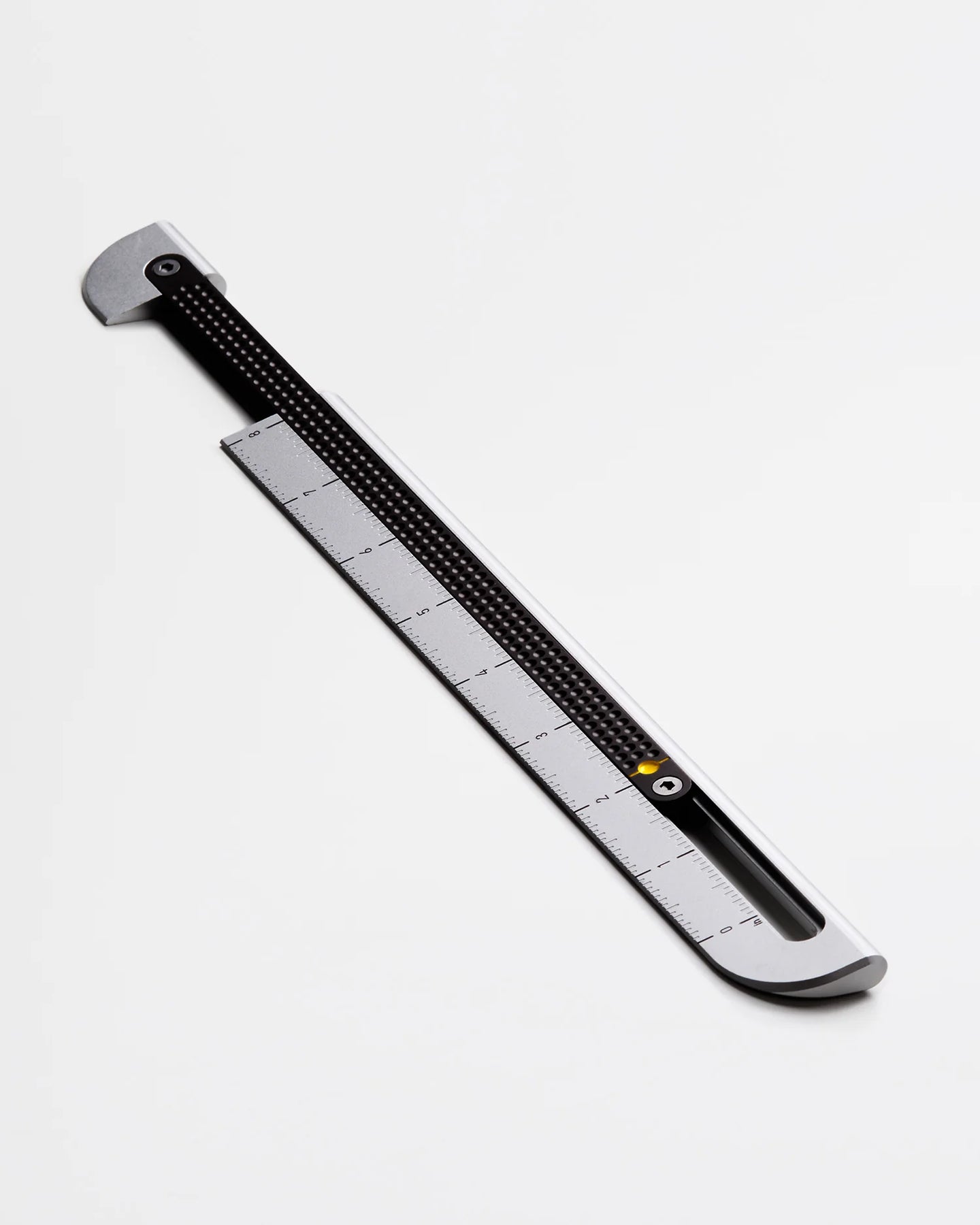In a game of inches, the Metrolog ruler is an unfair advantage. It takes imperial measurements up to 8”, with ¹⁄₁₆" increments, with Metric measurements accommodated up to 20cm, in millimeter increments along the way. Metrolog’s telescoping neck — paired with dimpled grips and an obsessively considered slide resistance — adapts to meet the measure of one’s curiosity. Its anodized silver and grey finish, CNC milled gradation increments, and distinctive yellow indicator make for an accurate, easy read of any critical measurements.