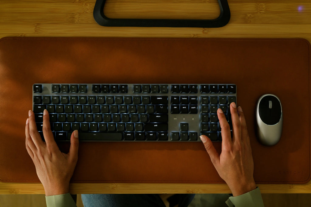The Satechi SM3 Slim Mechanical Backlit Bluetooth Keyboard boasts a full numeric keypad, making it the perfect choice for business and office professionals whose tasks require extensive numerical input. Its sleek, minimalist design features an aluminum enclosure, adjustable feet, and removable keycaps.