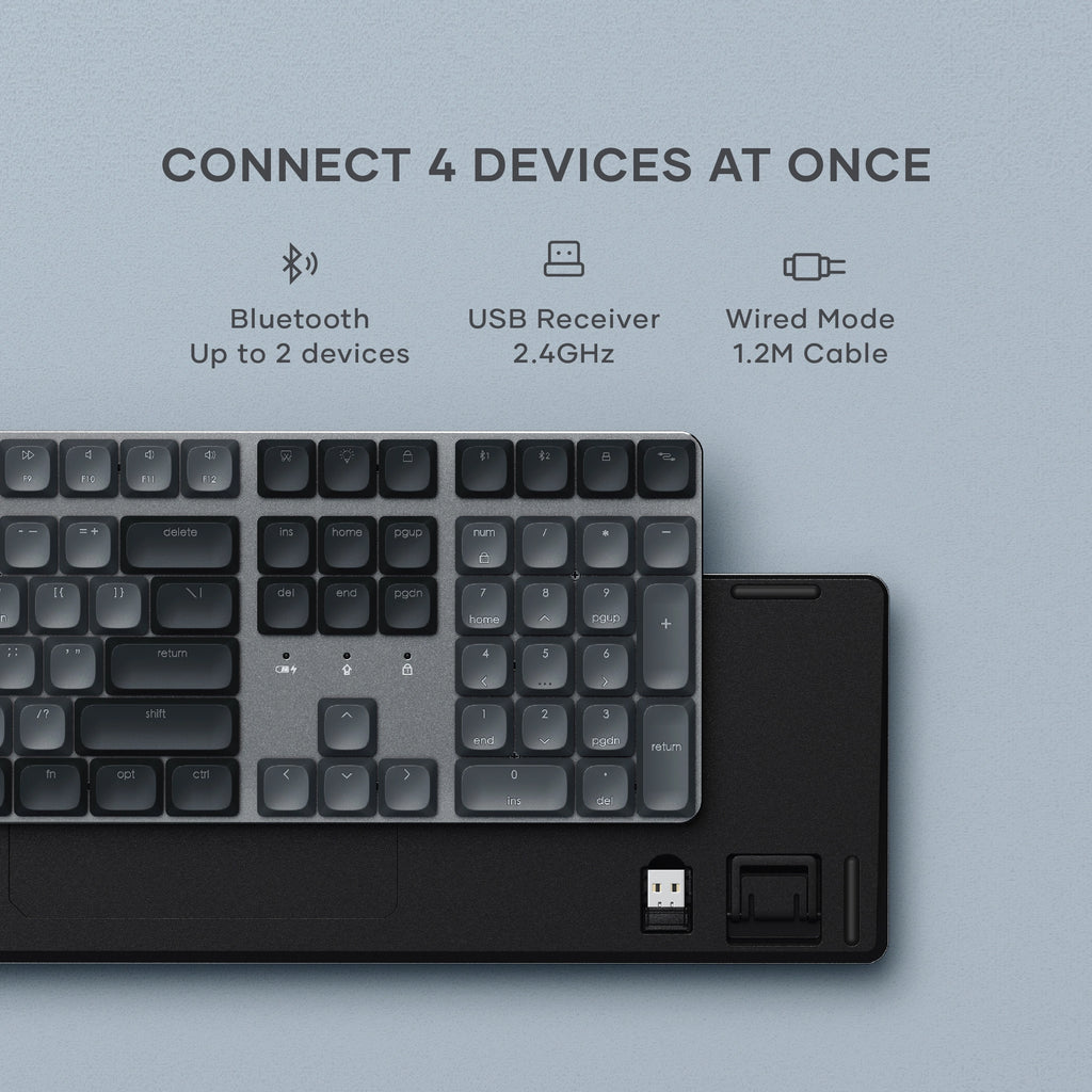 Effortlessly power your workflow by connecting up to four devices at once, and instantly switch between them with the versatility of dual Bluetooth 5.0 channels, a 2.4 GHz USB receiver, and a reliable wired connection.