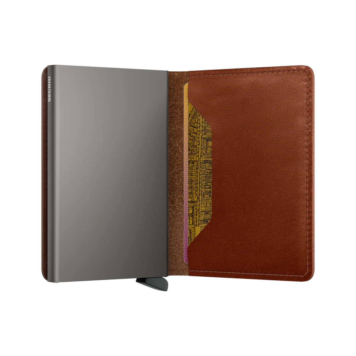 Secrid Slimwallet Texano Saddle is small in size and surprisingly large in storage capacity. The exterior holds banknotes, receipts and cards, while the aluminium Cardprotector allows you to slide out cards with one simple motion and protects them from bending, breaking and unwanted wireless communication. Miniwallet is the most icocnic wallet and the perfect all-rounder from Secrid.