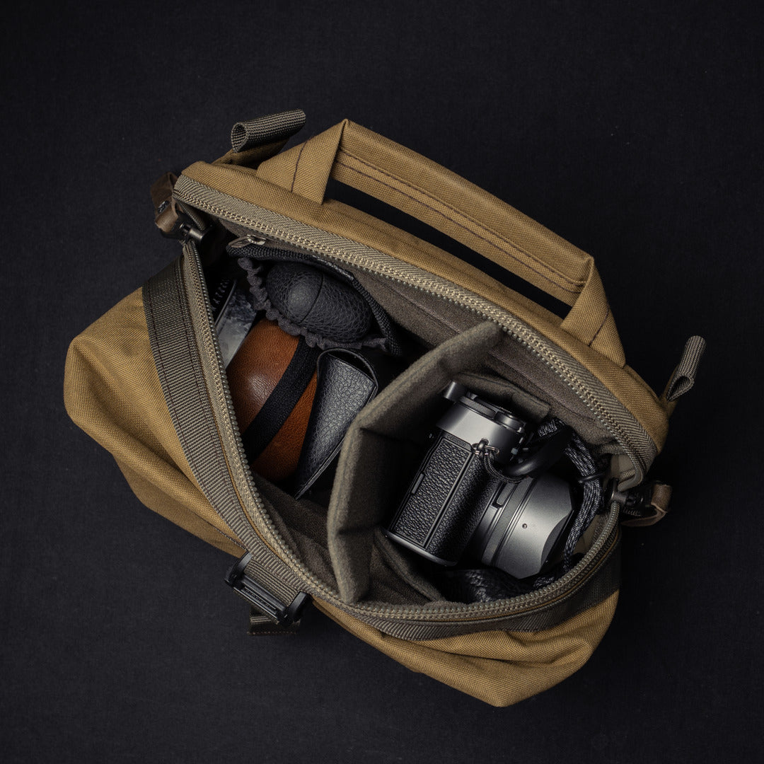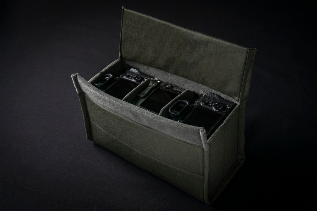 The EASY RIDER and LIGHTNING RIDER bags are compatible with a padded Quick-Access Camera Insert, capable of holding up to 2 full-frame mirrorless camera bodies and 3 lenses.