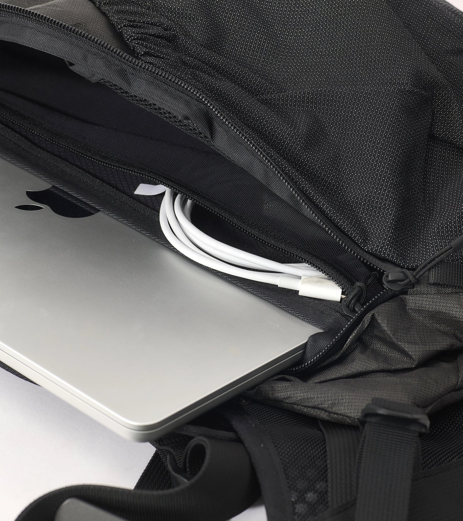Includes a dedicated laptop sleeve and a zippered mesh pocket in the main compartment, suitable for devices up to 14 inches, including the MacBook Pro.