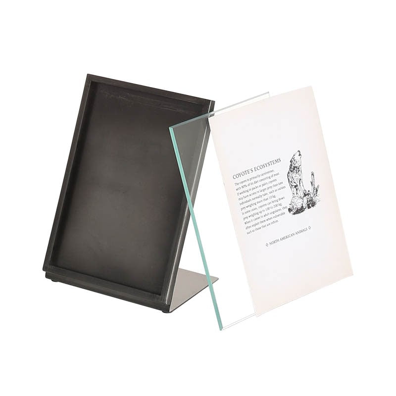 The metal frame has been stripped of all unnecessary elements, giving it a somewhat dignified appearance. The L-shaped stand not only makes it difficult to tip over, but also looks beautiful from any angle. Use it to hold menus in a cafe, price lists in a shop, or your favorite photos and pictures at home. The illustrations designed for each frame size include little trivia about the animal in question, so be sure to read them.
