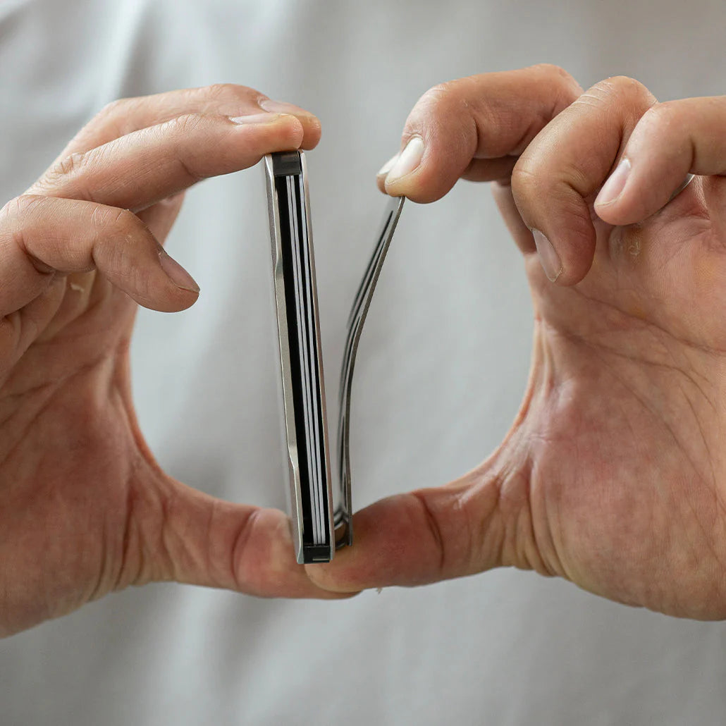 Formed from Grade 2 Titanium, this lightweight yet ultra-durable clip seamlessly integrates with your SK1, adding secure external storage for up to 10 folded bills, additional cards, or essential documents. Whether you're streamlining your wallet for daily carry or prepping for travel, the titanium clip brings both versatility and refinement to your setup.
