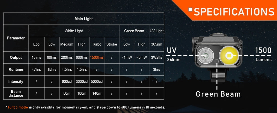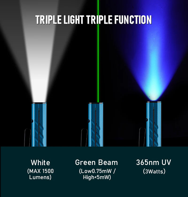 Including 7000K white light with a max output of 1500 lumens, 520nm green laser, and 365nm UV light, the E60 is engineered to be significantly more portable. With dimensions of 99.9×30.4×29.9mm and a weight of 94.9g, it balances full functionality with enhanced carry convenience, making it ideal for everyday use.