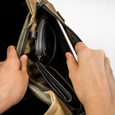 Add-on Pocket Modules can be attached to the front of the bag and also used individually as sling pouches. For example, use the Add-on Zipper Pouch Sling Pouch to carry important belongings for a stroll nearby your hotel when traveling.