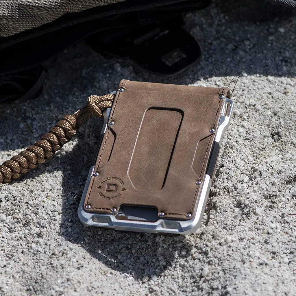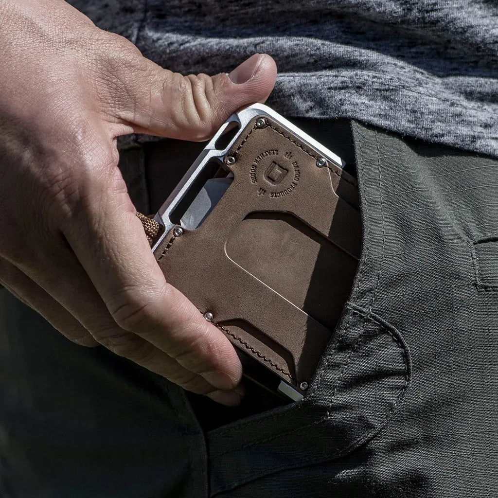 The M1 combines CNC Machined 6061 raw aerospace aluminum with raw genuine leather; a fine mixture of an industrial “bullet-proof” chassis with fine leathers. The metal RFID blocking card cavity can hold up to 6 cards depending on card thicknesses.