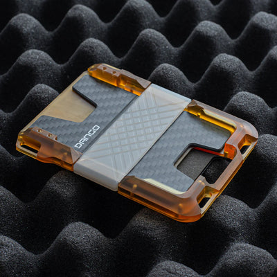 The M1 Maverick Ultem Wallet with DTEX pockets and carbon fiber backplate is a premium EDC accessory designed for those who prioritize both lightweigt durability and style. Constructed from CNC machined Ultem, a transparent lightweight yet incredibly robust thermoplastic material, this wallet is exceptionally resilient to daily wear and tear. The DTEX pocket material on the M1 Ultem Wallet provides both resilience and a distinct texture, enhancing grip and resisting wear and water damage. The carbon fiber backplate not only adds a sleek and futuristic aesthetic but also enhances overall structural integrity and RFID protection.