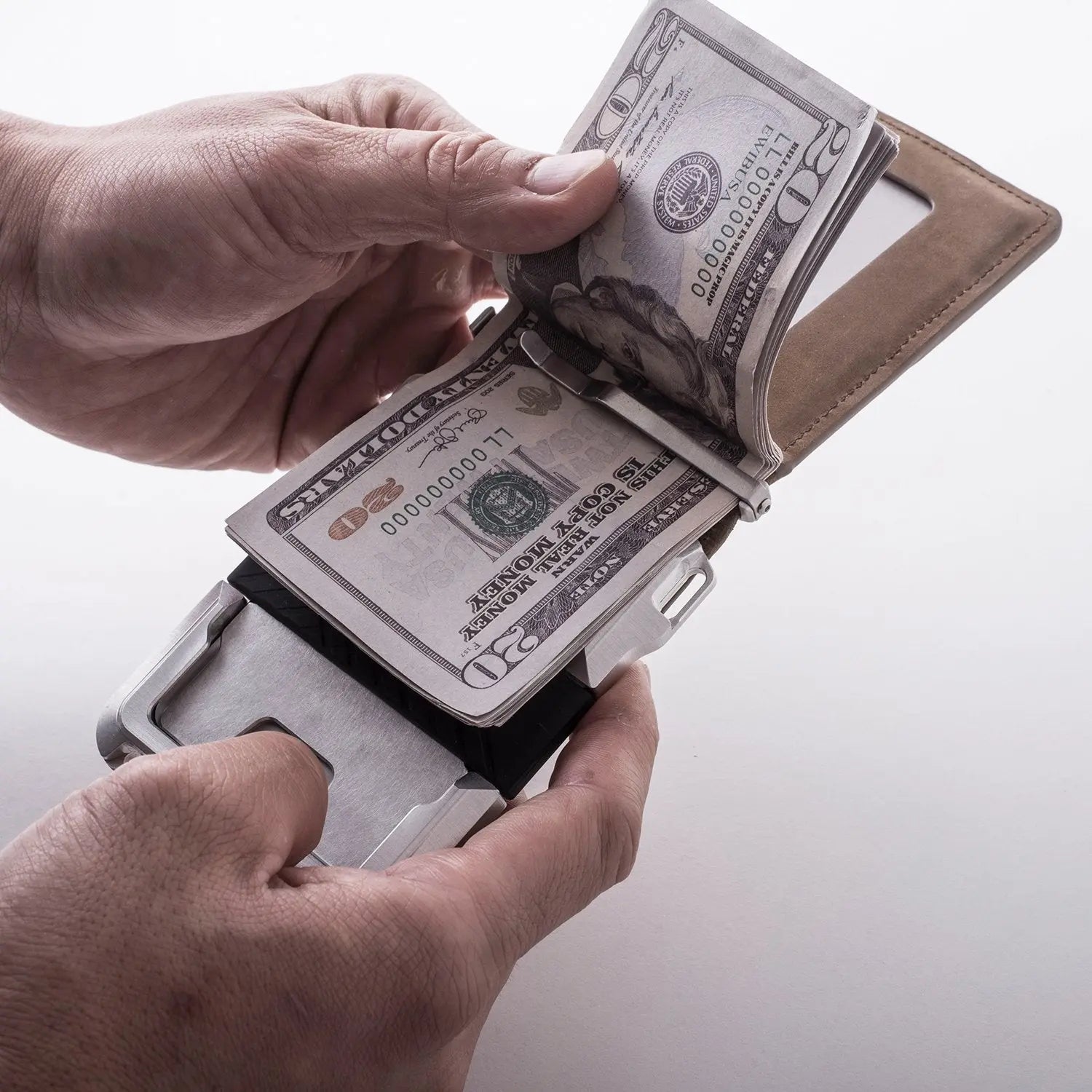Now here is the Pocket Clip being a companion to your M-series Bifold Wallet: While serving a great clip to tether your Dango Wallets to, the Pocket Clip can be easily be installed onto your M-Series Bifold wallet by simply sliding it through the fold of the bifold pocket. In this configuration, it serves as a great cash clip - and not just for a few bills - it can hold up to 10-12 bills, maybe more. In addition, having the Pocket Clip on your M-series Bifold Wallet gives it a whole new look while providing an awesome bottle opener!