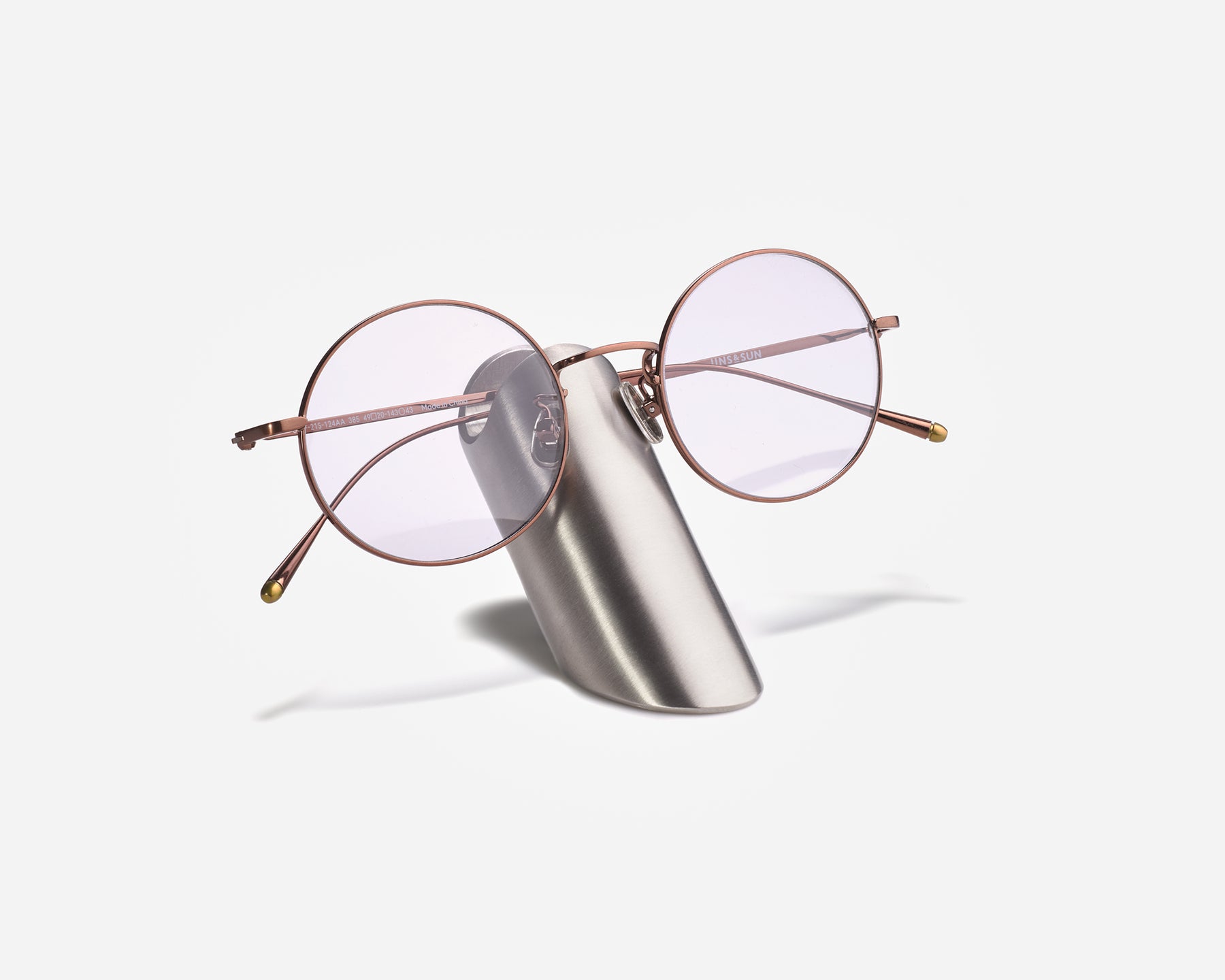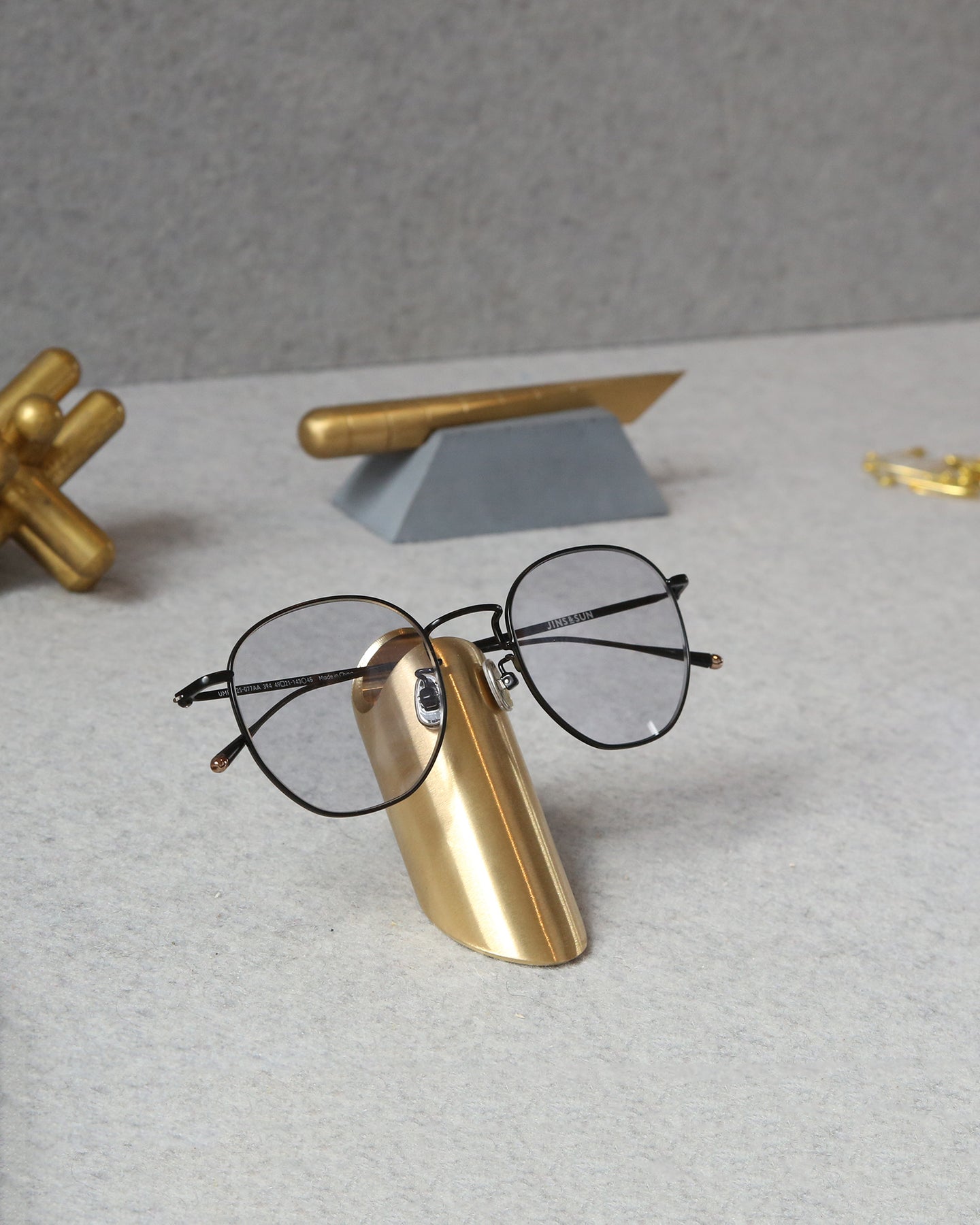 The Eyewear Stand accommodates any style of frame, and glasses almost appear to be leaning back, fully reclined. A distinct face-like quality emerges — a museum moment with a faint whiff of Groucho Marx.