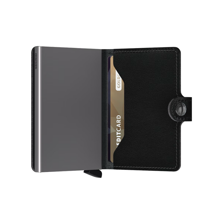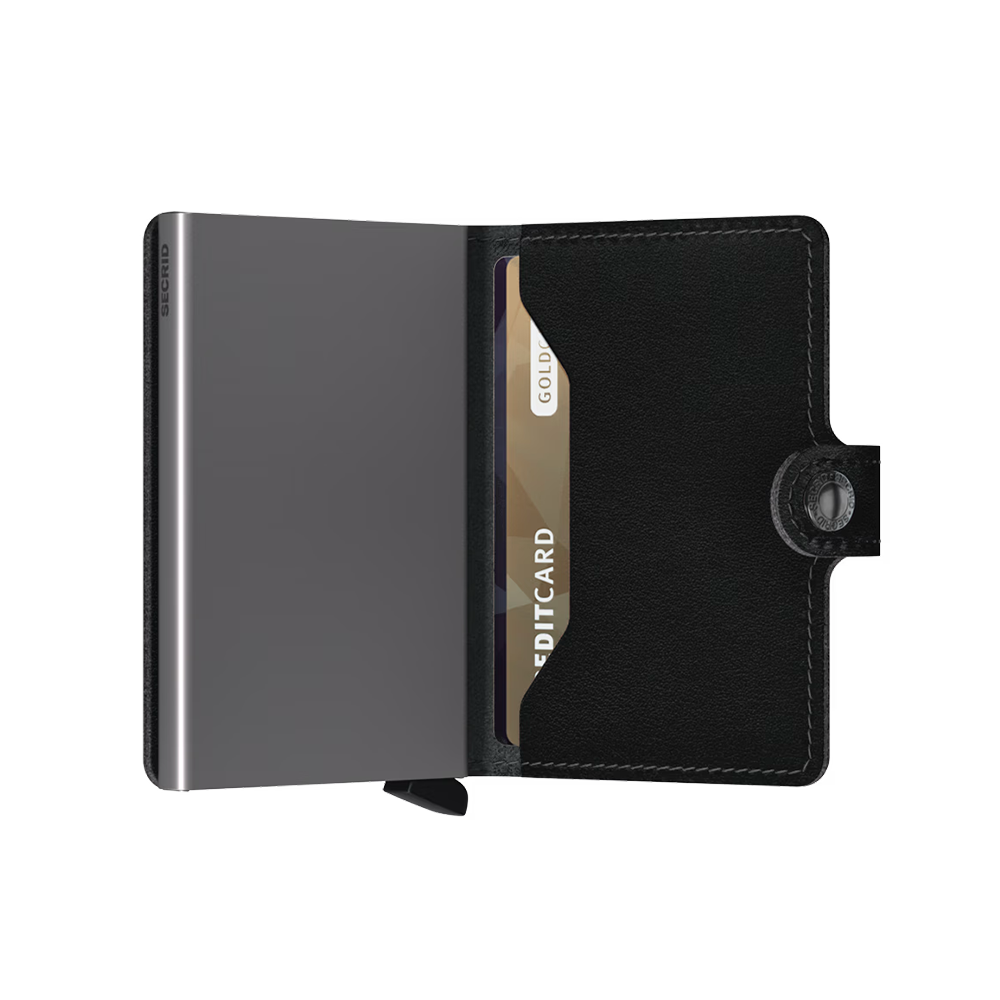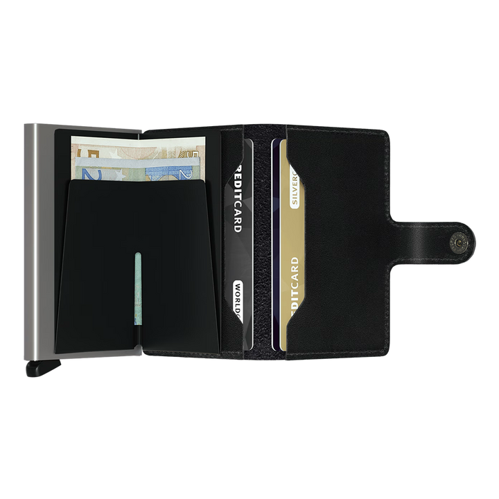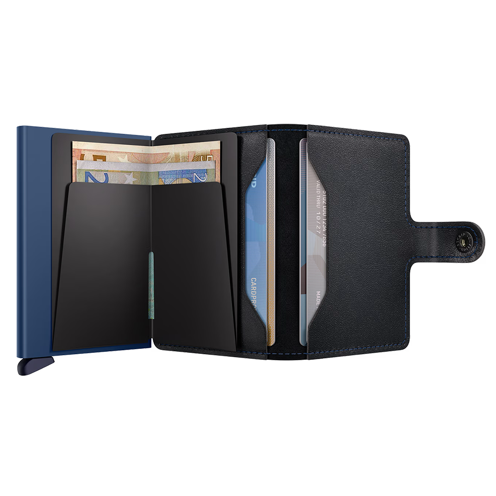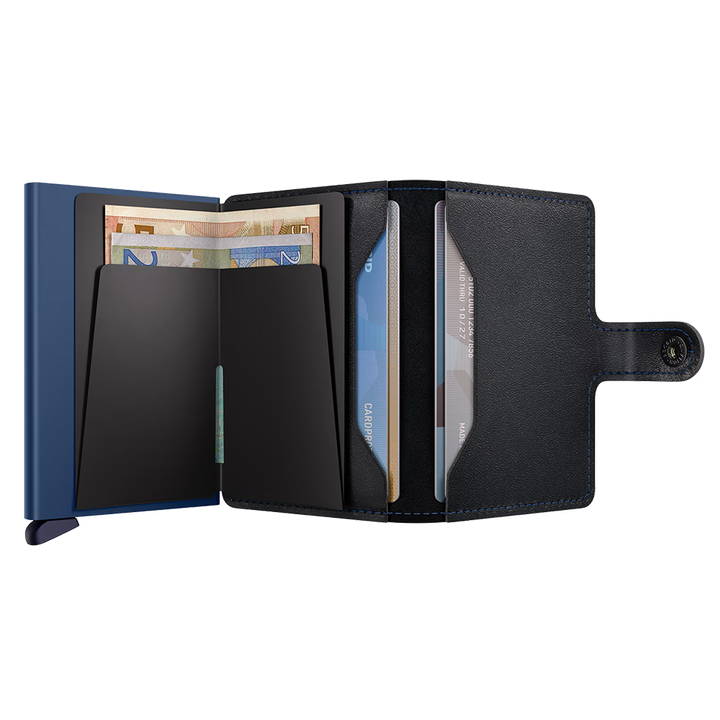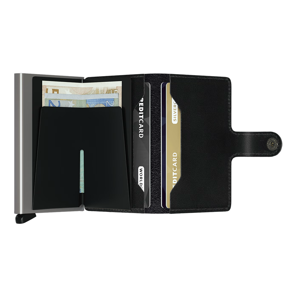 Small in size and surprisingly large in storage capacity, the Miniwallet combines the best of both worlds. The exterior holds banknotes, receipt and cards, while the aluminium Cardprotector allows you to slide out cards with one simple motion and protects them from bending, breaking and unwanted wireless communication.