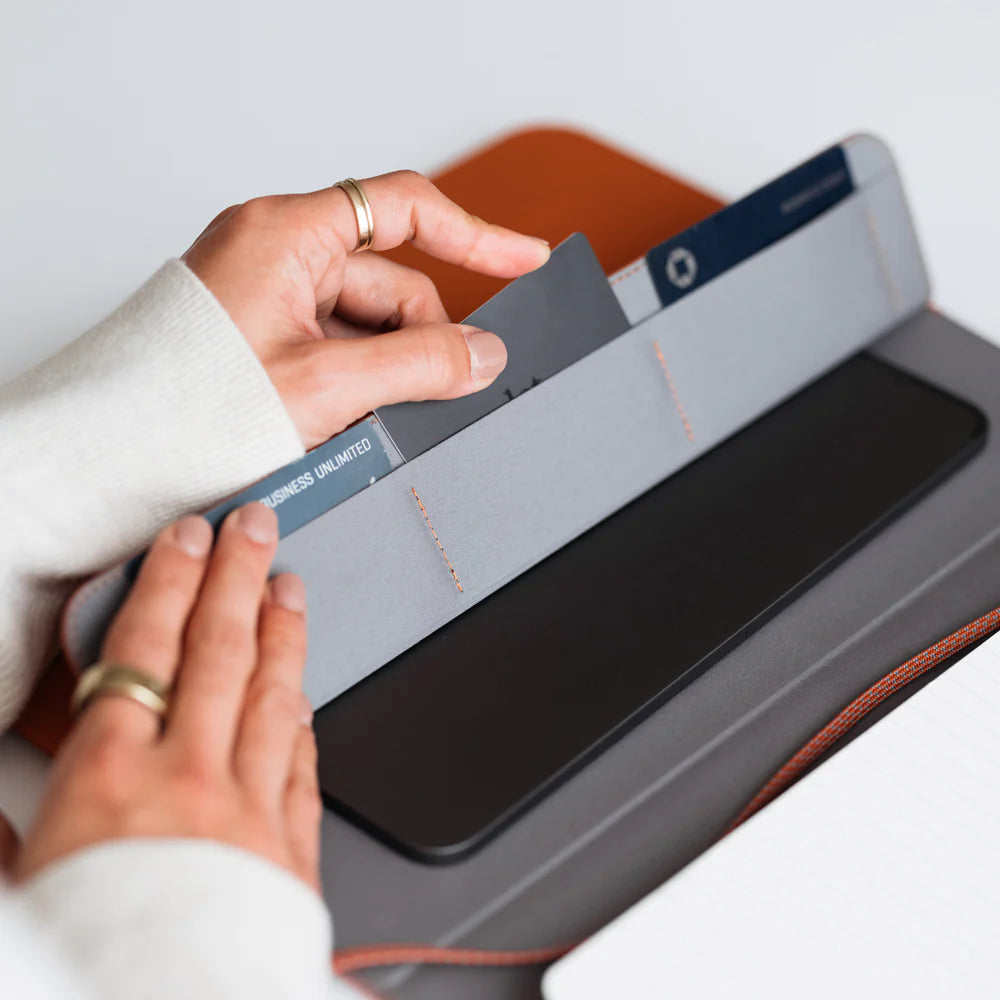 Card pockets are completely hidden when not needed, yet always easily accessible and perfect for storing business cards, credit cards, or IDs.