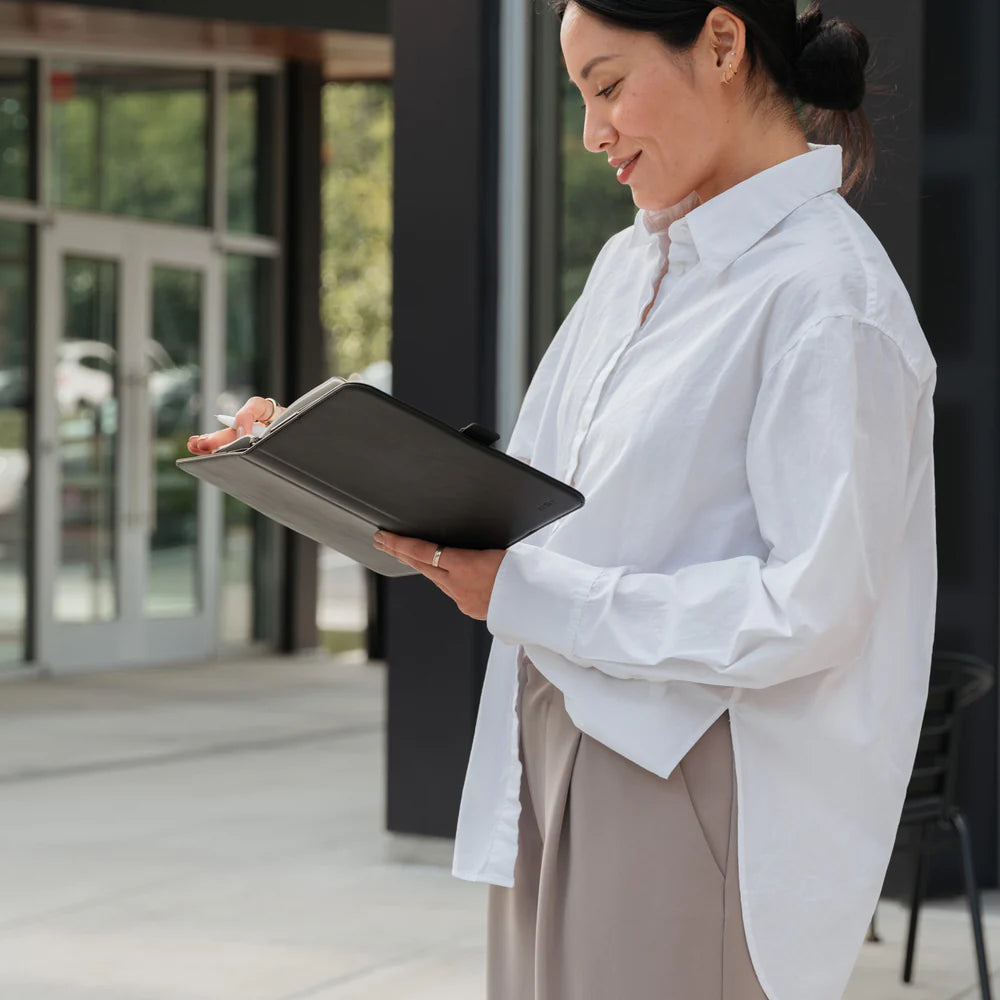 No more zippers or buttons to slow you down. Our custom elastic cord closure offers quick, reliable access to your notebook.
