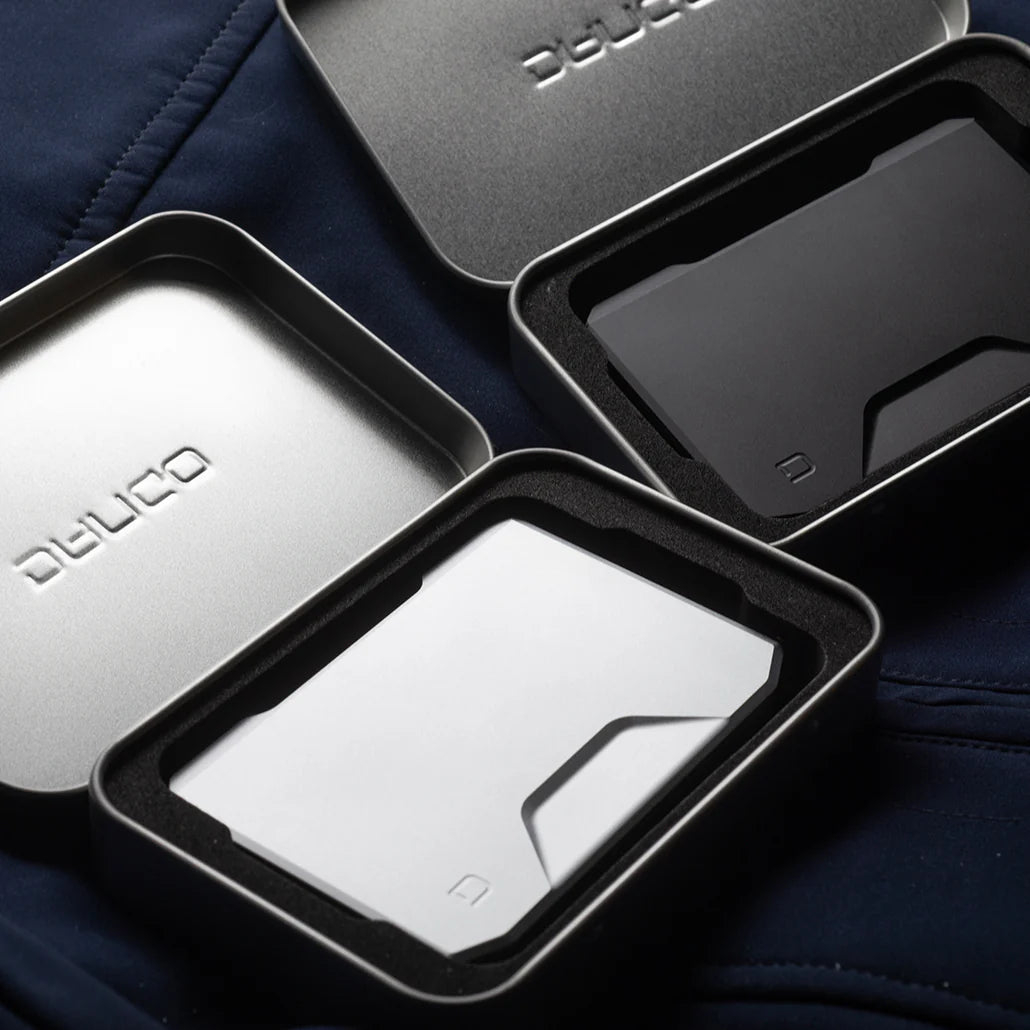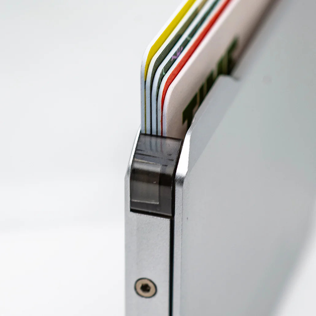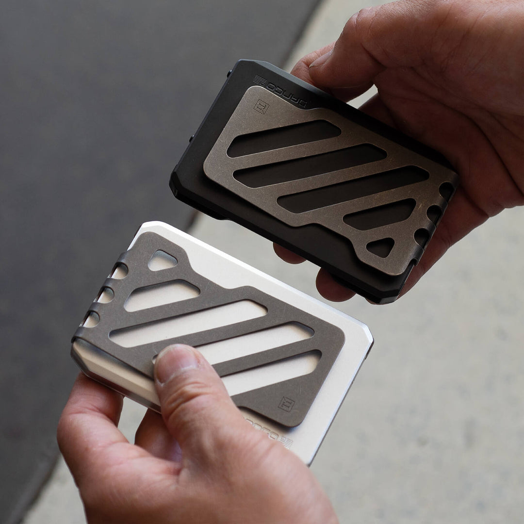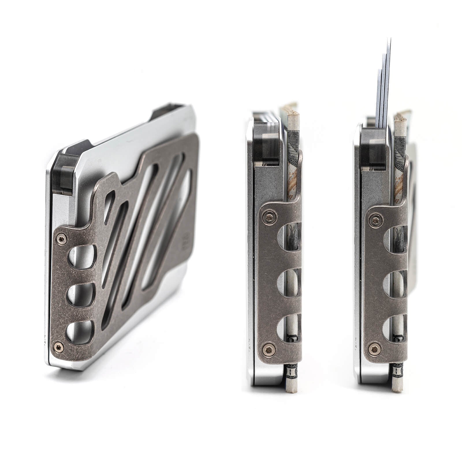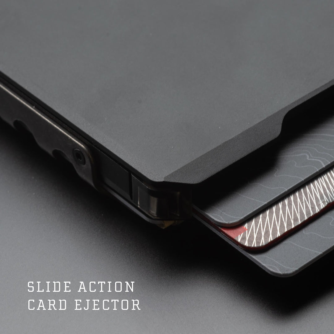 With a simple upward push of the front plate, your cards are smoothly deployed in a refined, fan-like spread—giving you clear visibility and effortless selection. This mechanical precision is more than just convenience; it’s a tactile experience; it offers a satisfying fidget factor, with a mechanical action that clicks and slides with the precision and snap of a finely tuned firearm — making it as addictive to use as it is functional.