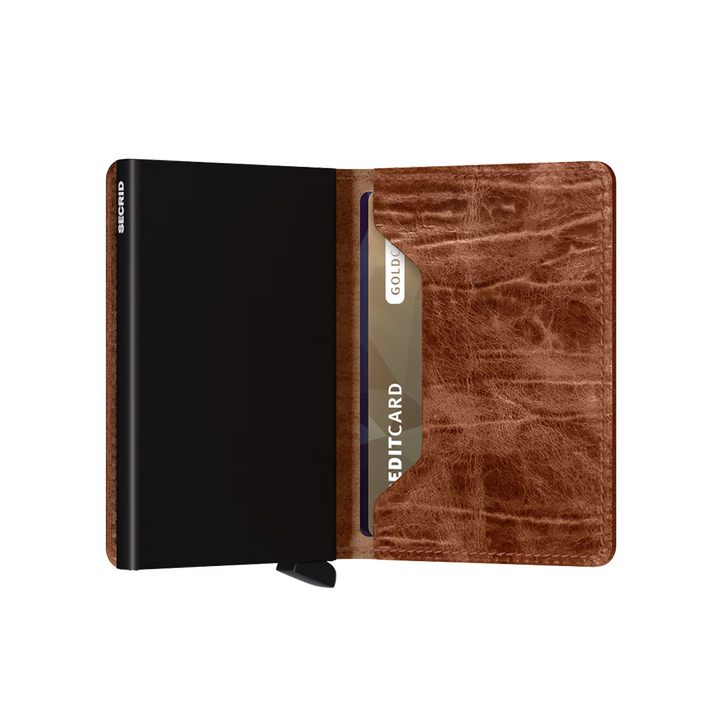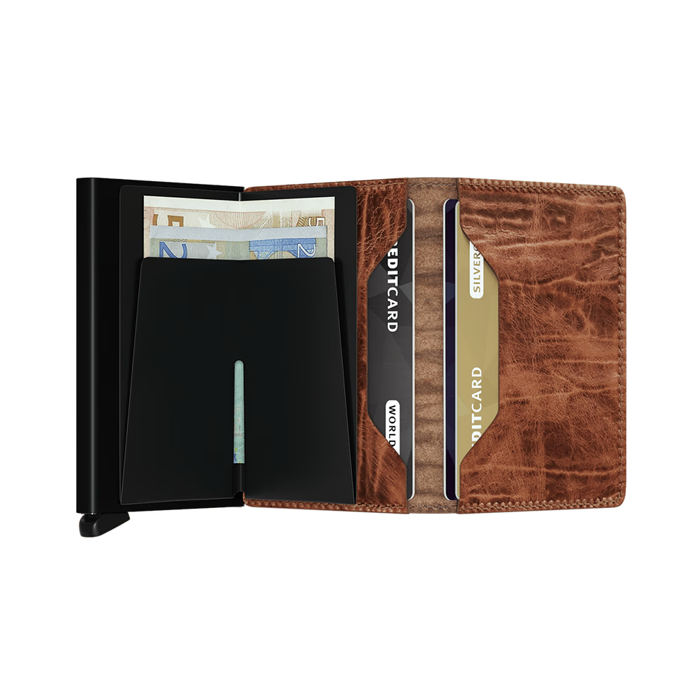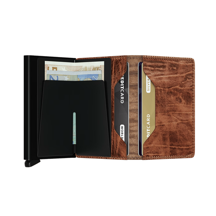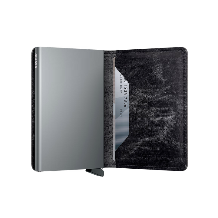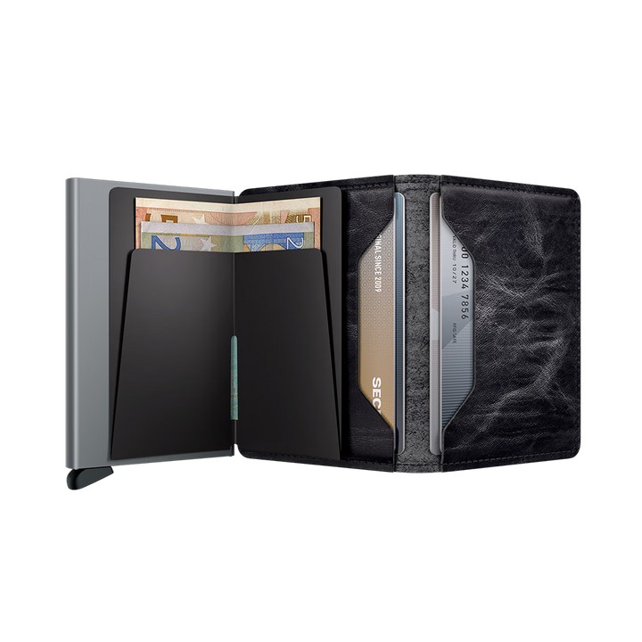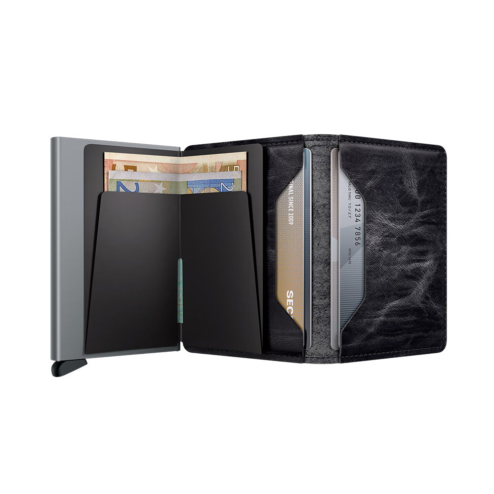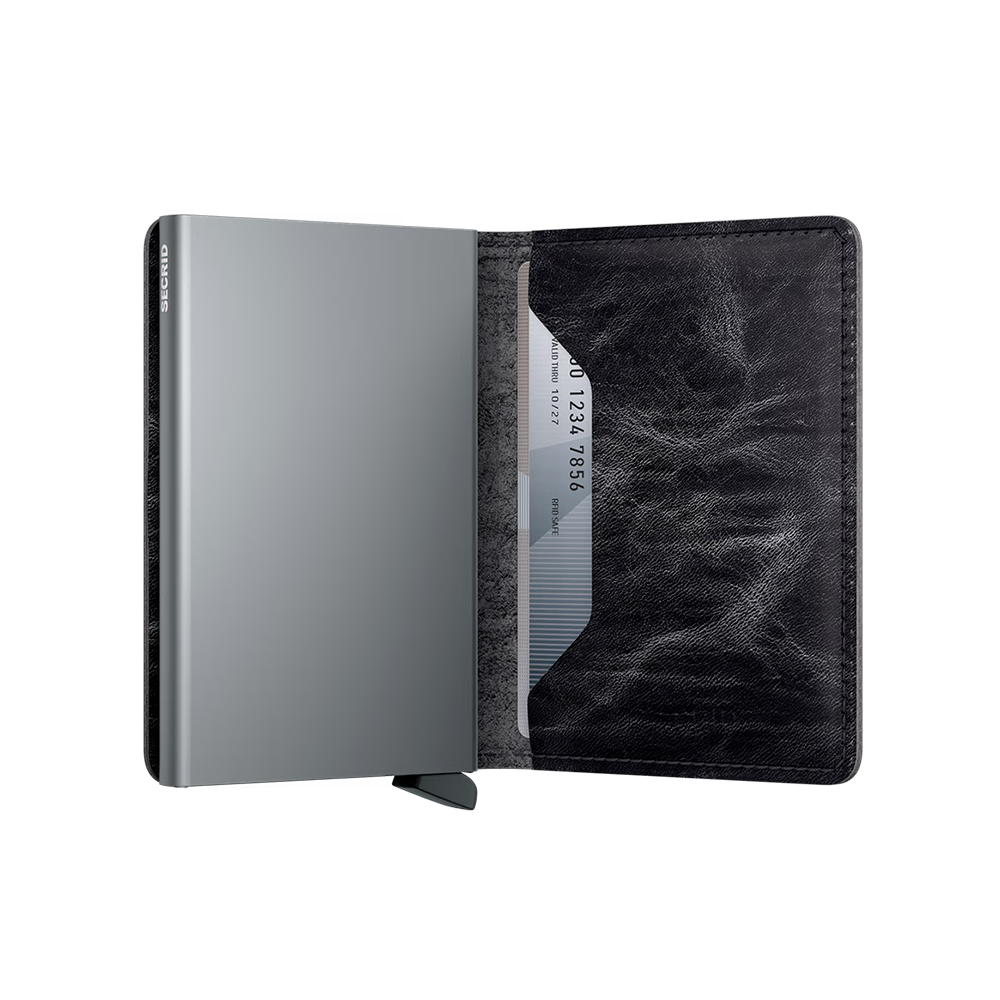 Its slim profile allows the Slimwallet to fit perfectly into any pocket. The open exterior is designed extra wide to accommodate cards, banknotes and receipts. The Cardprotector mechanism enables you to slide out cards with a simple motion, while the aluminium construction protects your cards from bending, breaking and unwanted wireless communication.