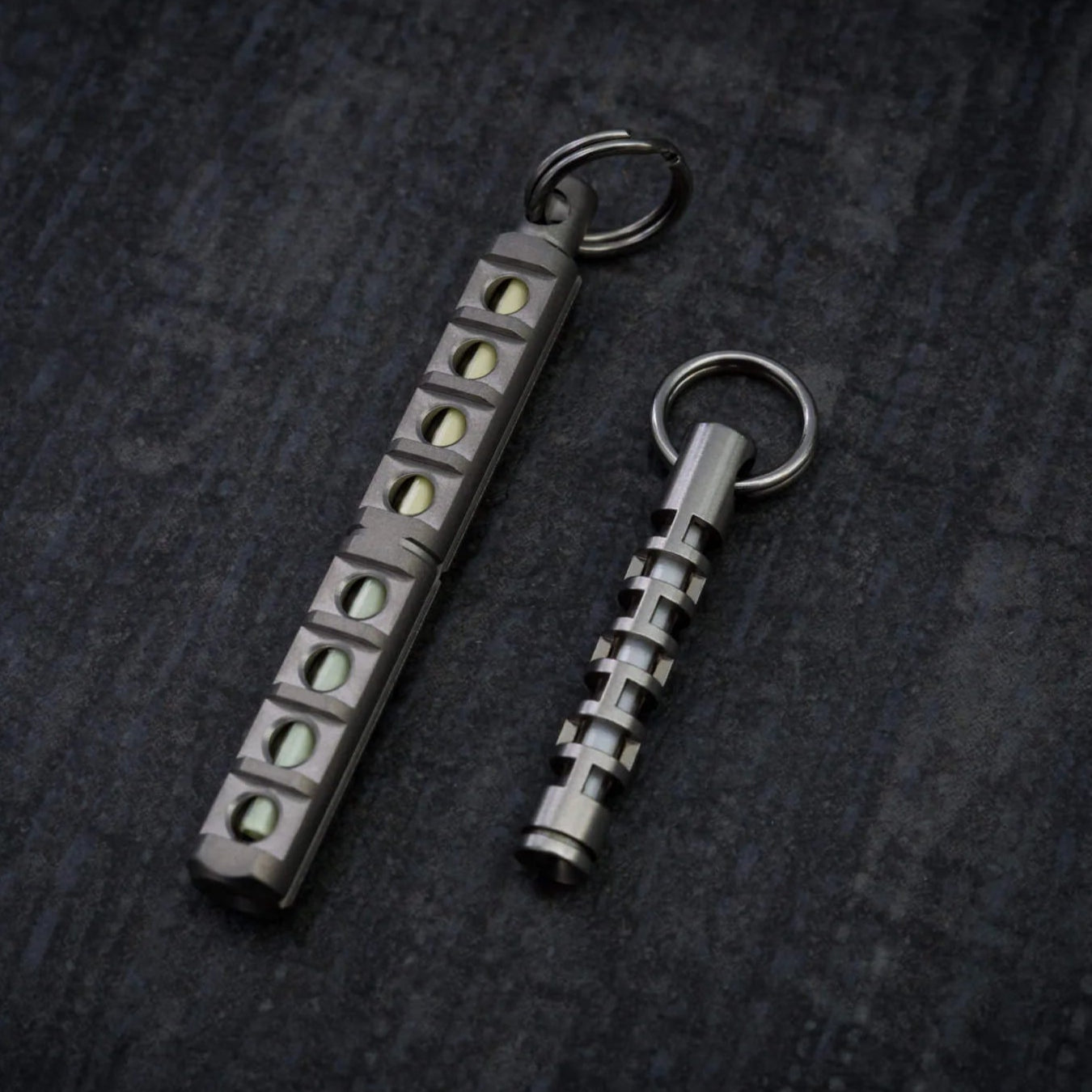 The TEC-T323-2X Isotope PRE Fob is a titanium metal housing suitable for mounting two 3mm x 23mm glass tritium vials. It is bead blasted to a uniform matte finish.