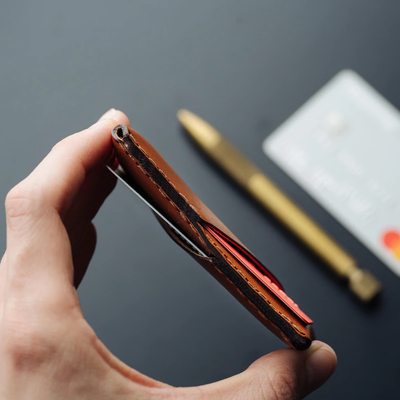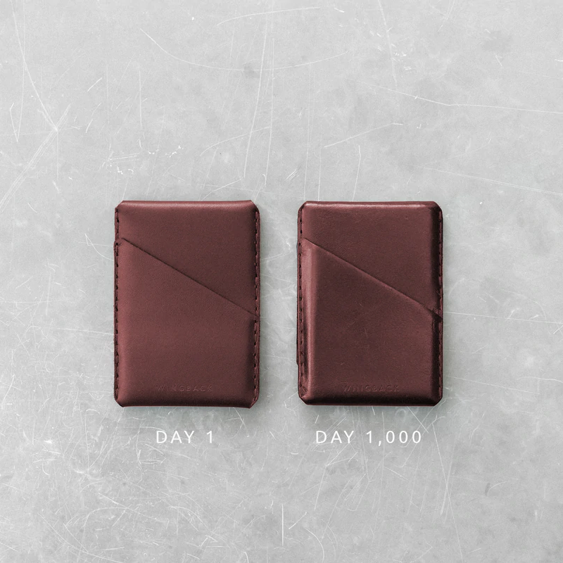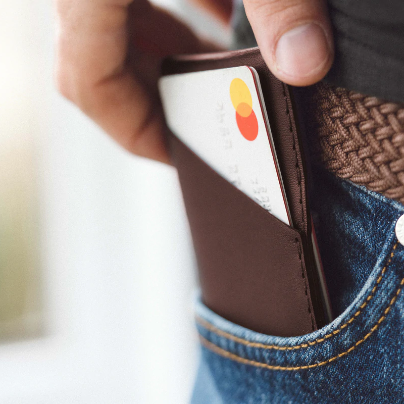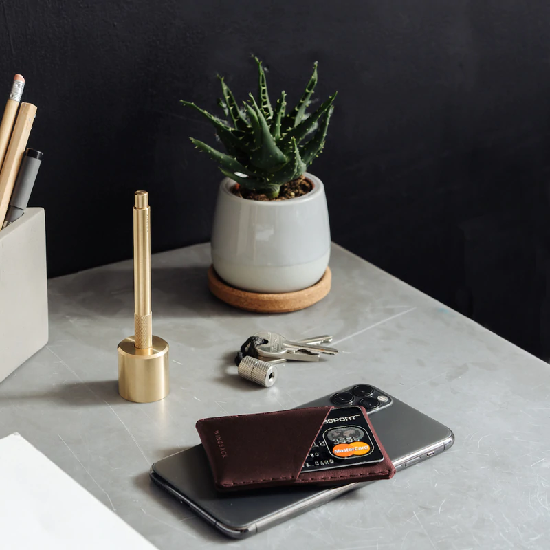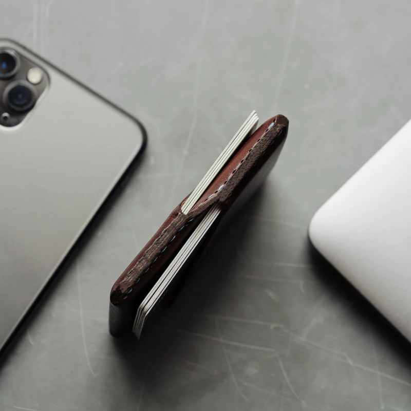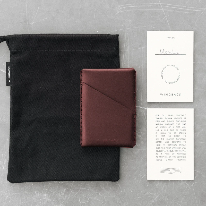 The Winston Card Holder was designed to fix a problem. Natural leather tends to stretch over time, so a wallet’s capacity can only increase – along with the risk of it losing its contents on the move. This led us to design a stainless steel leaf spring system hidden inside the card holder that will ensure its dual pockets always retain a tight fit, whether you carry one or 10 cards. Its symmetrical pockets also allow for fast one-handed access to your top cards when in a hurry. Bulk up your wallet, slim it down, and your cards will always stay secure. Handmade from exceptional, hard-wearing materials, the Winston Card Holder should comfortably outlive any leather wallet you’ve ever owned and work equally well on day one as on day 1,000. Choose the leather, then personalise your Card Holder with a choice of thread, initials and even your phone number to help track it down if it ever goes missing.
