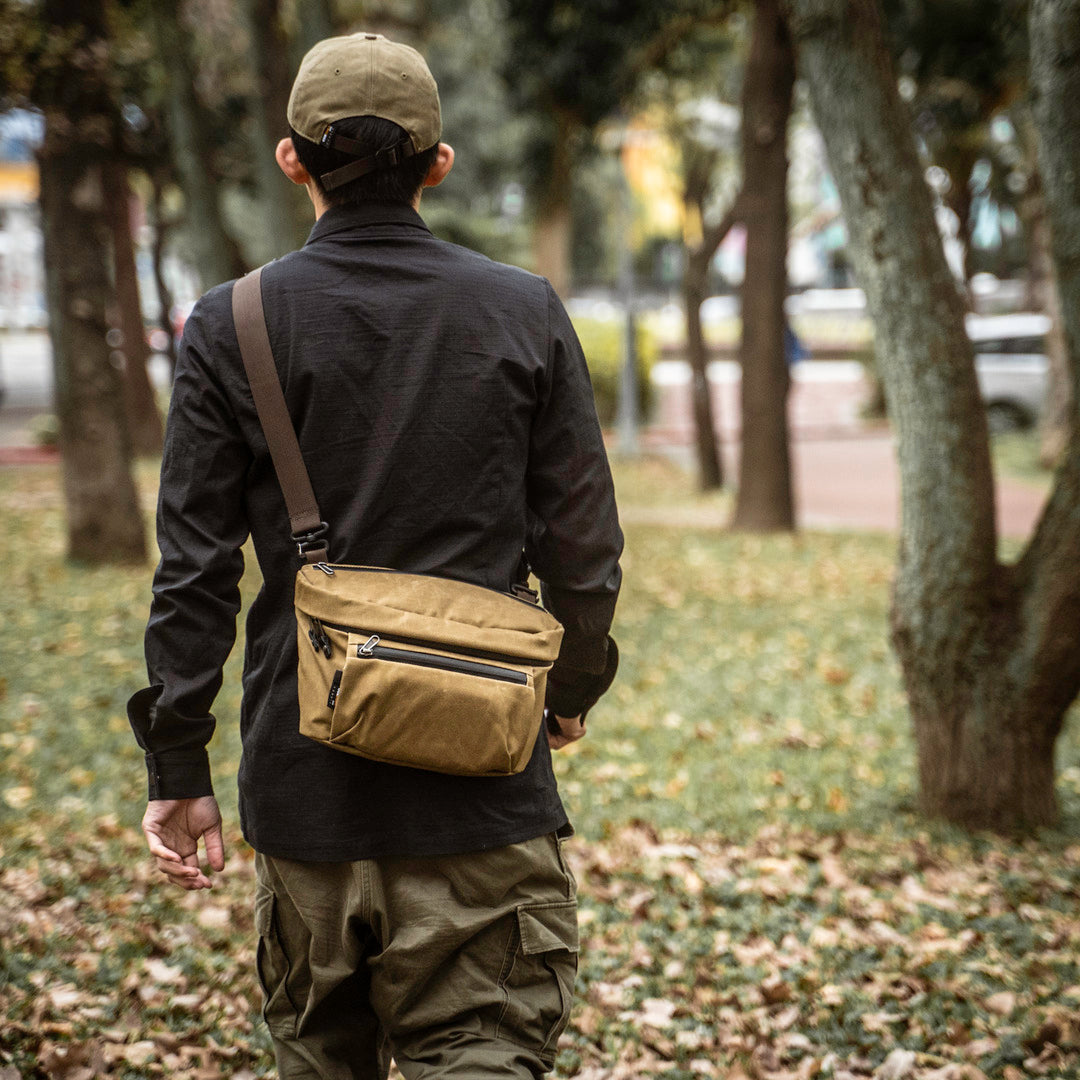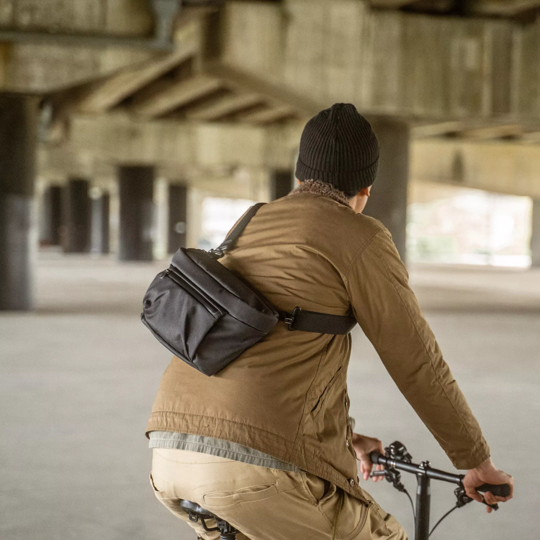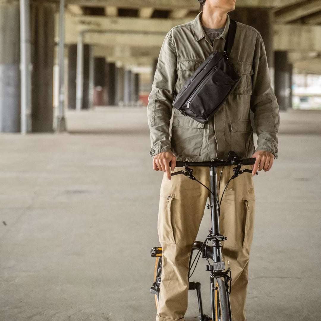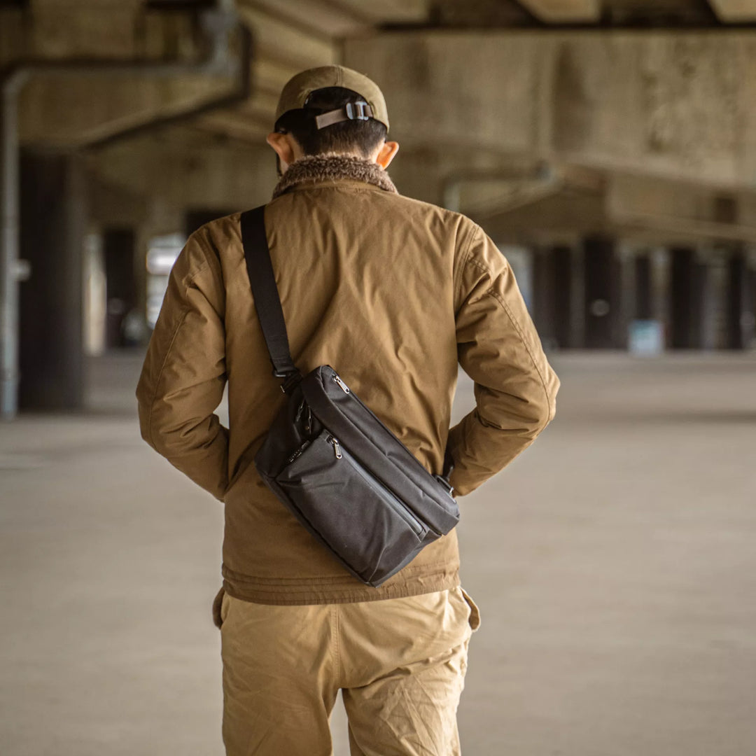 The chest/sling pouch can be easily paired with casual clothing such as a T-shirt, and can also accommodate an umbrella (under 28 cm / 11 inch) / a 500ml water bottle / a small camera.
