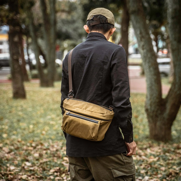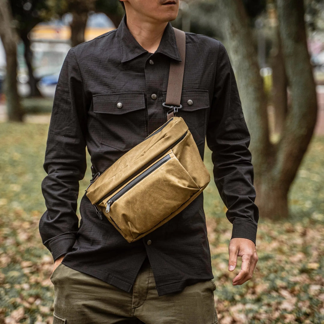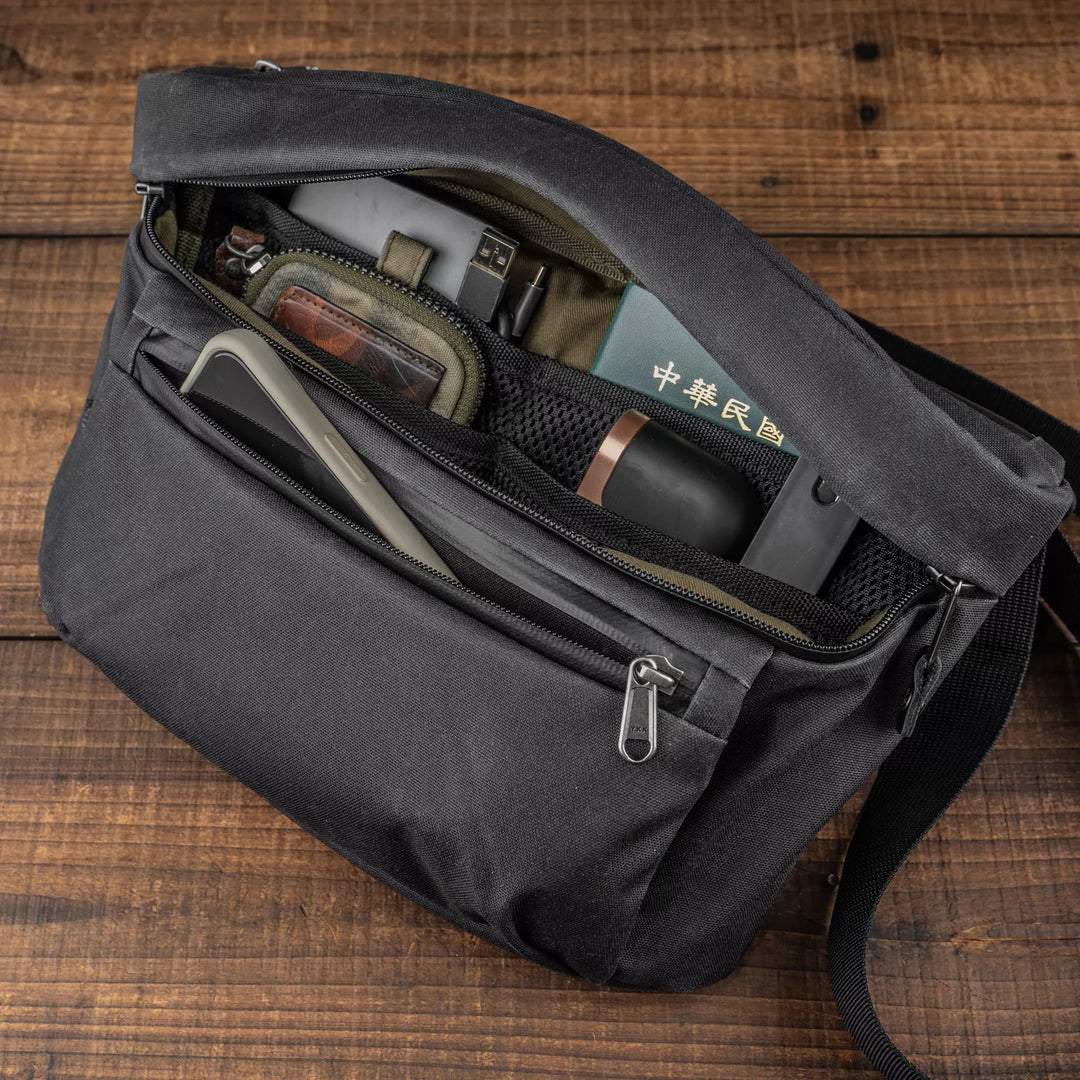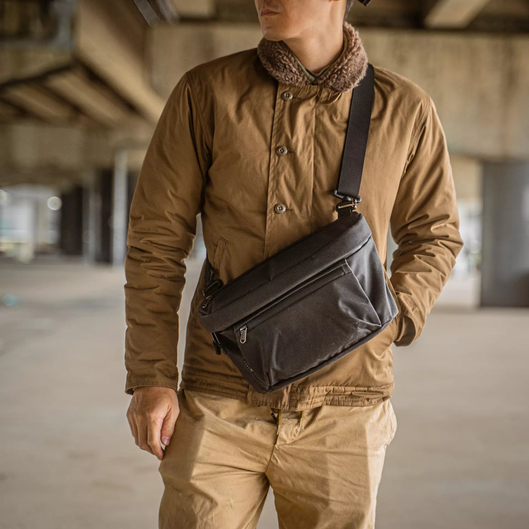 The chest/sling pouch can be easily paired with casual clothing such as a T-shirt, and can also accommodate an umbrella (under 28 cm / 11 inch) / a 500ml water bottle / a small camera.