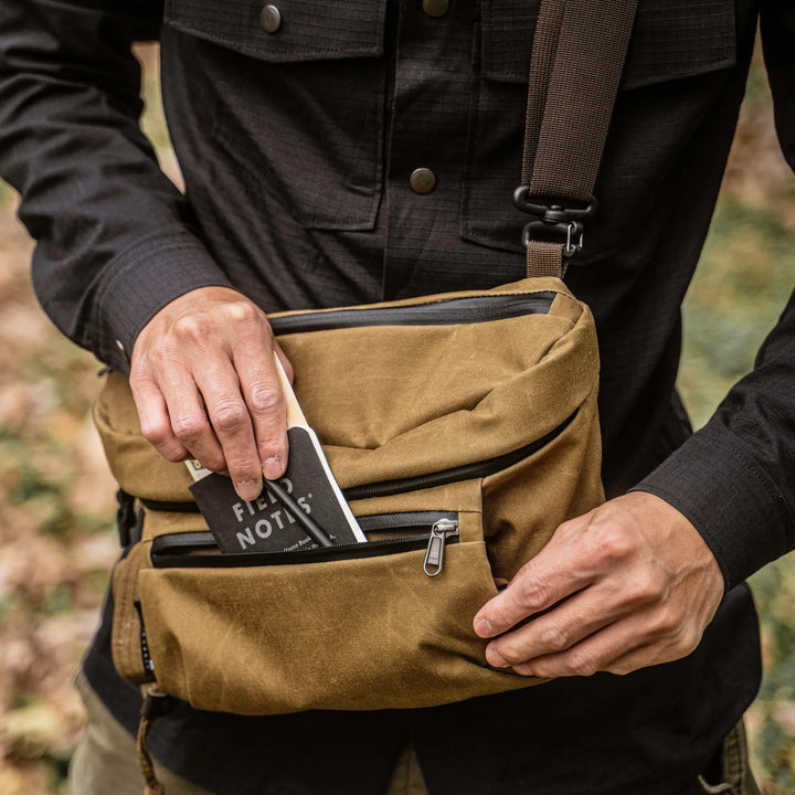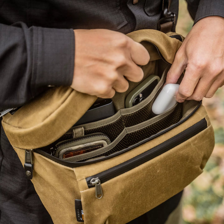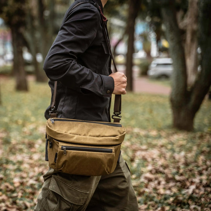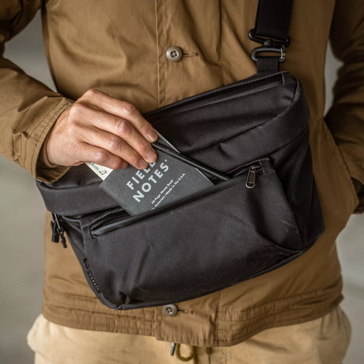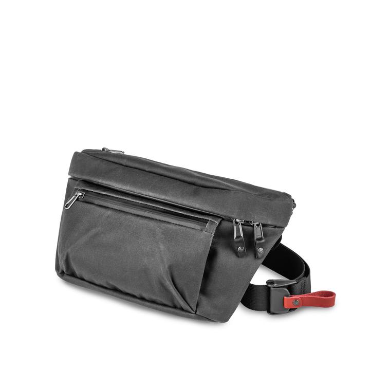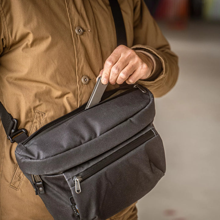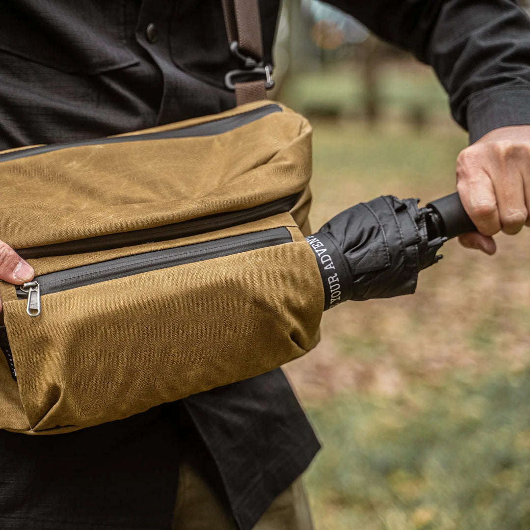 The chest/sling pouch can be easily paired with casual clothing such as a T-shirt, and can also accommodate an umbrella (under 28 cm / 11 inch) / a 500ml water bottle / a small camera.
