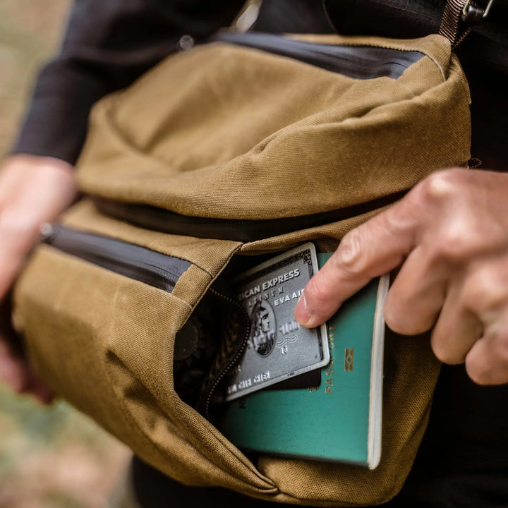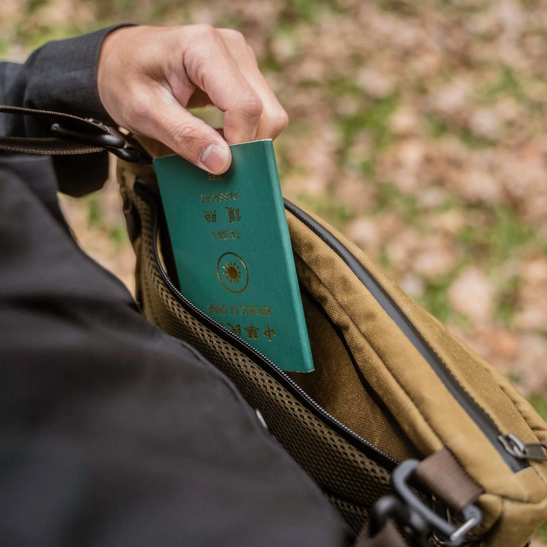 Completely out of sight, the zipper pocket located behind the front pocket can be used to store passports and boarding passes.