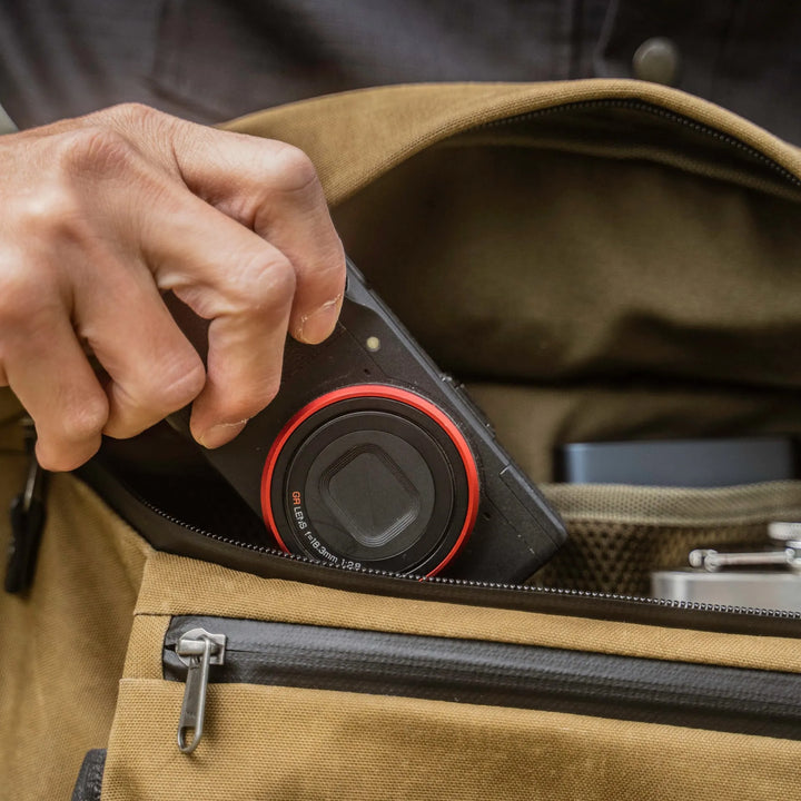 Cameras such as the Ricoh GRIII, Sony RX100, Canon G7X, Fujifilm X100F, etc. could be fitted in the main compartment.