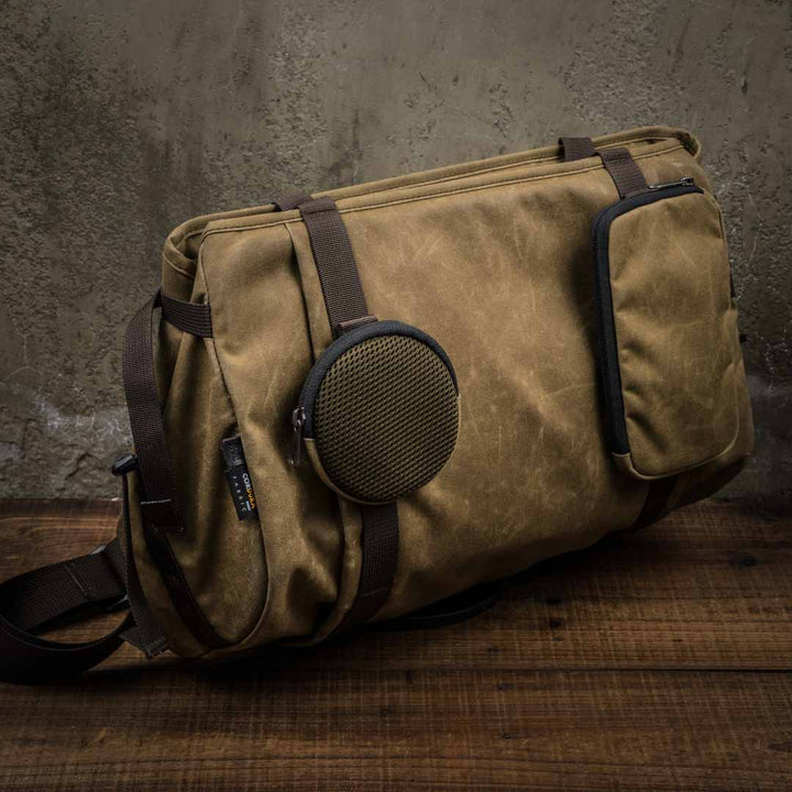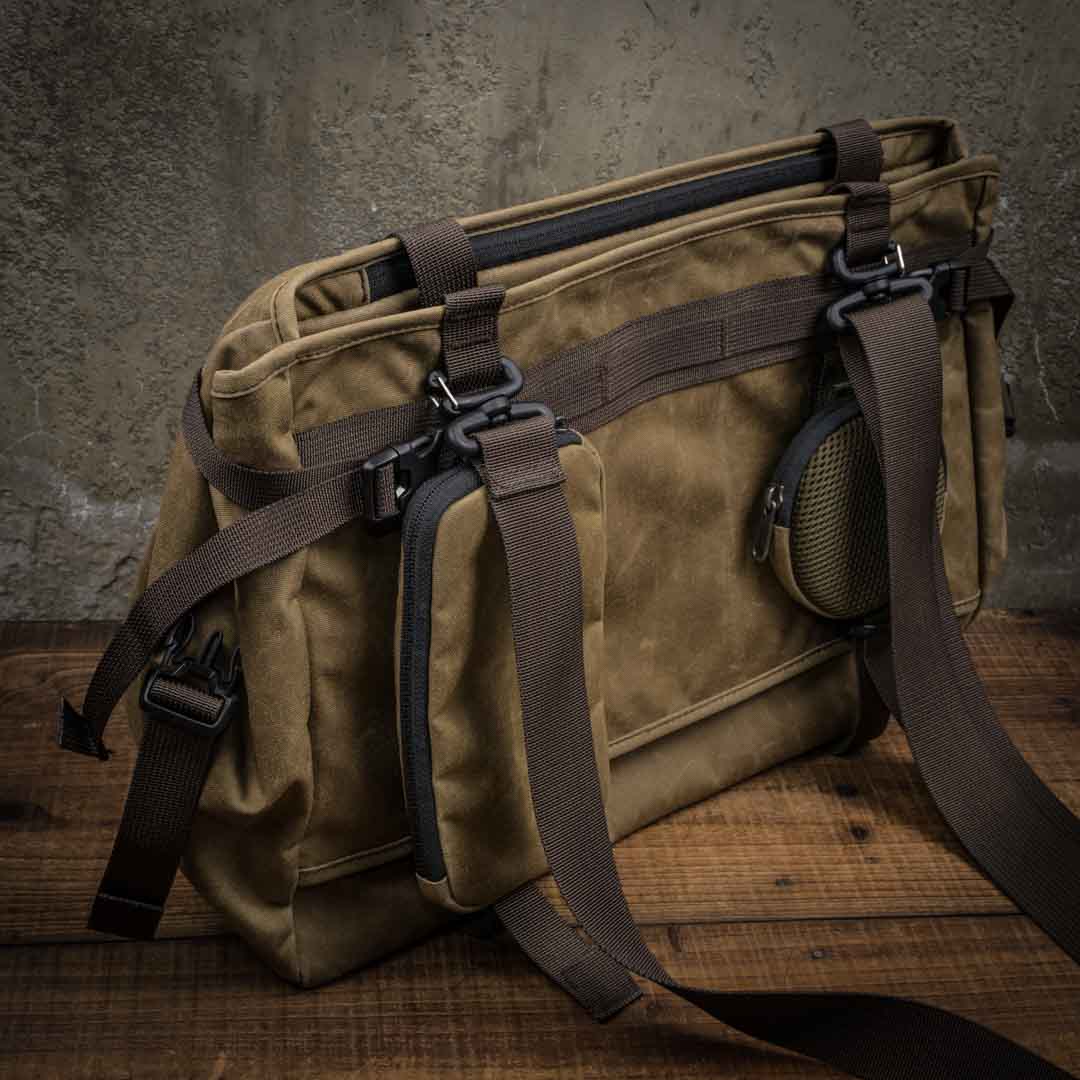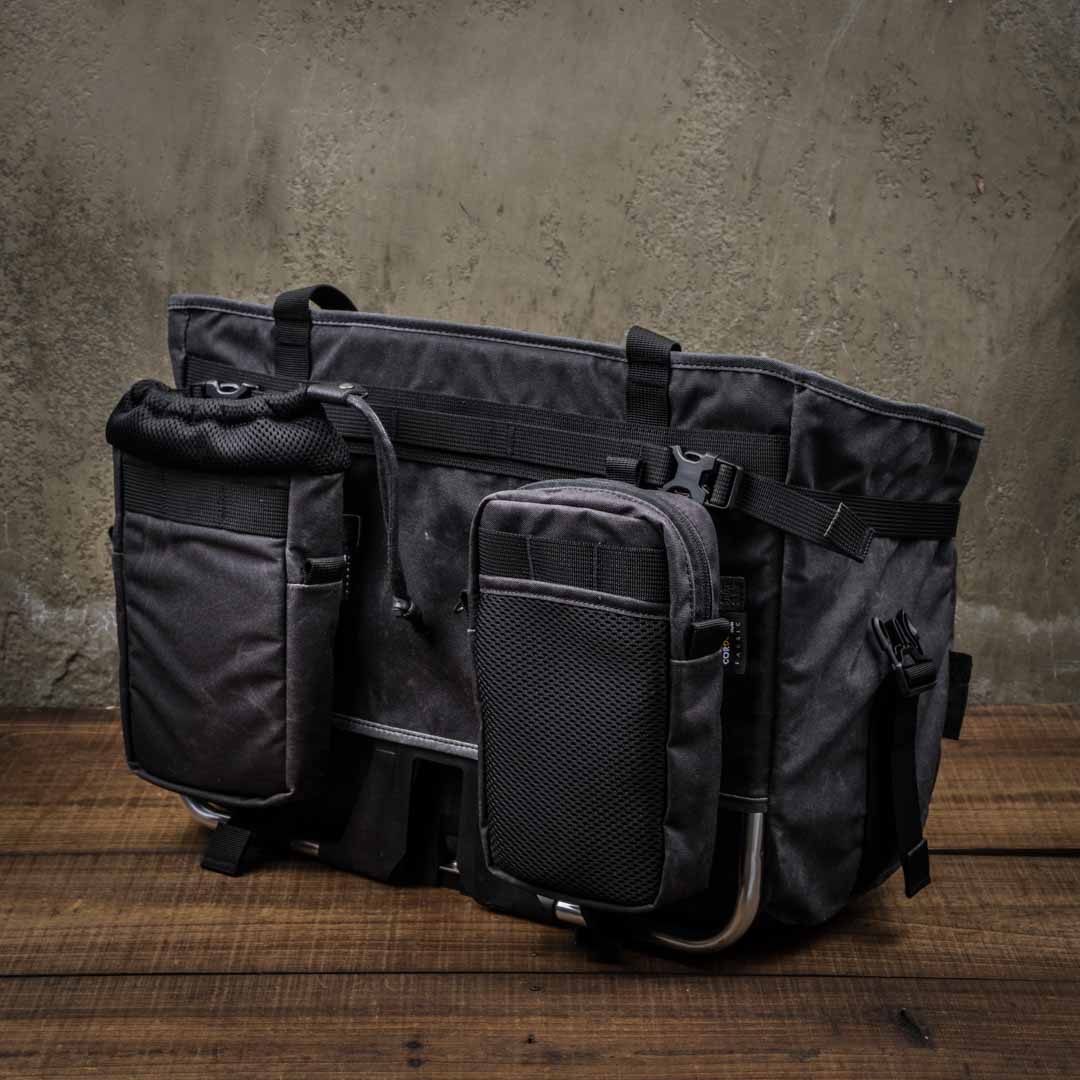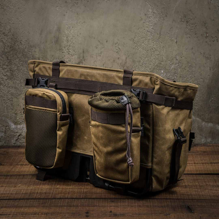 Optional military grade Cordura ® canvas Add-on Pouches can be attached to the front or back of the Pioneer Basket Bag.