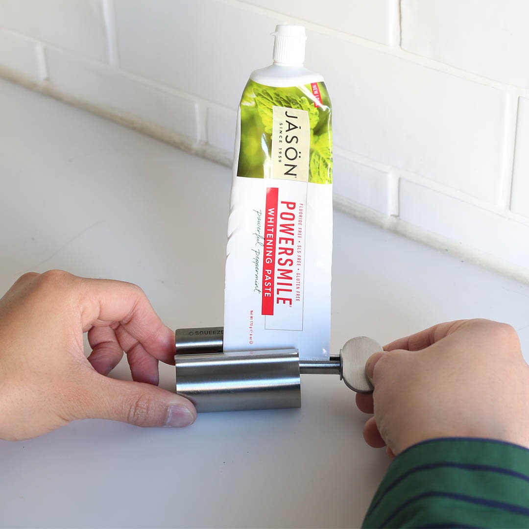 This is the "squeezer" you need when you want to use up every last bit of toothpaste, hand cream, or other tube contents. The winding mechanism allows you to turn the handle and squeeze the tube while squeezing, allowing you to powerfully squeeze out the contents. The large knob makes it easy to use, and the freestanding design makes it a space-saving tube stand. The simple design is accented by the "↑SQUEEZE OUT↑ NO WASTE" engraving. This convenient squeezer can be used in a variety of places, including the kitchen, bathroom, and more.